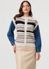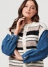 Stay warm in style with this unique jacket. It has a stylish layered look, giving the illusion of a knit vest layered over a denim jacket. It also features a round neck and a relaxed fit. The front fastens with buttons and it also has buttoned cuffs on the denim sleeves.