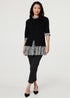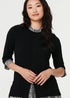 This clever top gives the illusion of a shirt and a jumper in one. It has a layered shape, with a jumper texture over the top of a ruffled shirt silhouette. It also features a high neck, 3/4 sleeves and a layered thigh length hem. Wear with blue jeans for a relaxed outfit, or smart trousers for a workwear look.