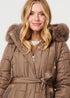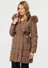 Stay cosy in style in this padded puffer jacket. It's finished with a faux fur trim around the hood and has a flattering tie waist. It features a zip front, a high neck and a thigh length hem. It also has a soft contrast texture around the hood and on the pockets.