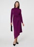 Dress for a formal event with this elegant midi dress. It has a unique asymmetric shape, complete with flattering ruches and a twist front detail. It also has long sleeves, a high neck and a slim a-line fit. Wear it with heels and a simple clutch to let this dress stand out.