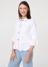 Flatter your figure with this smart peplum-style shirt. It has a beautiful frilled detail around the hem and 3/4 sleeves, giving it a floaty and feminine look. It also features a collar and buttons. Wear it for the weekend with blue jeans, or elevate with a fitted skirt for a smart occasion.