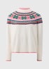 Learn moreWrap up in the cosy comfort of our Joyful Fairisle jumper in cream, a delightful addition to your winter wardrobe. Crafted from a sumptuously soft wool blend, this charming knitwear piece boasts a vibrant fairisle pattern in a cheerful blend of pink, cream, and hints of green. Pair with your favourite denim jeans and ankle boots for a casual and stylish weekend ensemble. Part of our joyful trend, combining warmth, style, and comfort to bring a cosy and vibrant touch to your style.