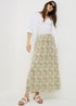 Get set for effortless summer style with this khaki printed maxi skirt, crafted from soft cheesecloth viscose for a light, breathable feel. The billowing maxi length and floaty fit create a relaxed, feminine silhouette, while the drawcord elasticated waistband ensures an adjustable, comfortable fit. Perfect for weekend outings or casual daytime occasions, pair with a tucked-in blouse or simple cami and sandals to complete a chic, on-trend look.