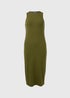 Crafted with meticulous attention to detail, this dress features a racer-style neckline that gracefully accentuates the shoulders and collarbone. The ribbed texture adds a touch of sophistication while ensuring a snug fit that highlights the natural contours of the body. Falling to mid-calf length, this piece offers both modesty and allure, making it a versatile addition to any wardrobe. Whether paired with heels for an evening out or sandals for a casual brunch, this dress promises style without compromising comfort.