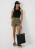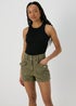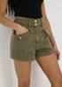 Introducing our Khaki Utility Denim Shorts. A perfect blend of style, comfort, and durability. Crafted from high-quality denim material, these shorts are designed to offer the utmost comfort while ensuring you stay in style. The deep khaki colour gives it a classic yet adventurous look, making it a versatile addition to your wardrobe. Featuring multiple utility pockets and metallic button detailing, these shorts are not just about looks but also functionality. Dress them down with a simple T-shirt and trainers for a casual weekend look or add a blouse and sandals for a more polished summer outfit.