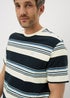 Effortless style meets everyday comfort with this navy stripe T-shirt. Made from 100% cotton in a regular fit, it features a classic crew neckline, short sleeves and subtle Lincoln chest embroidery. The back neck is finished with tape and chambray for a refined touch, while the navy, blue, and cream stripe design adds timeless appeal.