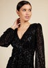 Sparkle and shine in style with this sophisticated dress! Designed in a practical black tone to match with your favourite accessories, it features a chic V neck, cosy long sleeves with added elasticity and signature detailing to the front for a unique finish. Embellished in stunning sequins, it's a must-have in your wardrobe this season.