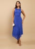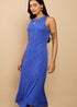 This blue textured midaxi dress offers sleek, sleeveless elegance with a rounded neckline. Its flowing a-line fit makes it ideal for summer weddings or casual get-togethers. Pair with wedge heels for a polished, trendy look.