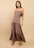 Refined and timeless, this mink dropped waist maxi dress features a bandeau neckline and sleeveless a-line cut. Perfect for cocktail parties, weddings, or evening occasions, it exudes effortless sophistication. Style with metallic accessories for a modern edge.
