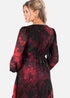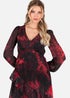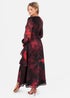 This abstract midaxi dress is set to be a staple for your most memorable occasions. Crafted from lightweight, flowy fabric, it boasts a refined empire waist, a classy V-neckline, gathered bust and long, elasticated sleeves that enhance your figure. The captivating abstract red and black pattern, along with dobby textured fabric featuring gold thread detailing, makes it perfect for both daytime and evening events. It's finished with cascading asymmetric ruffles on the ankle-grazing skirt, adding dimension and movement. Pair this dress with black strappy heels and understated gold jewellery for a complete look.