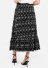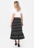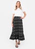 This stunning co-ord set crafted from comfortable black fabric features delicate white thread accents that highlight its intricate broderie finish. This peplum top boasts a charming square neckline adorned with a black ribbon and elasticated waist for an adjustable fit and it’s complemented by short puffed sleeves for an elegant touch. The matching midi skirt showcases a flattering waistline and achieves its graceful length with an additional ruffled layer creating a voluminous flowing silhouette. Wear them together for a perfectly coordinated look or mix and match for endless styling options!