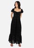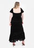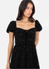 Crafted from luxuriously textured floral velvet and lace fabric, this black dress blends opulence with effortless comfort. The elasticated square neckline features a delicate V cutout with matching ties, while short puff sleeves bring vintage charm. An elasticated waist enhances the figure, flowing into a midaxi length skirt with a sheer gathered panel and ruffled hem for graceful movement. Pair with black heels and silver accessories for an elegant finish.