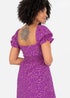 This enchanting dress features a radiant purple base adorned with a shimmering metallic gold speck pattern, creating a mesmerizing visual effect. Designed to flatter, it boasts an empire waistline that enhances your silhouette, complemented by a delicately structured bust resembling a bow. Elasticated shoulders and short puffed sleeves add a romantic touch while ensuring both comfort and style. For an extra dose of elegance, the dress is finished with a flowing skirt and a subtle split, allowing for graceful movement and a sophisticated look. Perfect for special occasions or evenings out, it pairs beautifully with gold heels and an elegant updo.