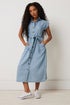 Why not introduce a dress to your denim collection? Made from a cotton rich fabric, this dress features a classic collar, button fastenings, a tie belt fastening and short grown-on style sleeves, Pair with your choice of trainers or sandals and you're good to-go! Model is 5'/152cm and size UK 8/EU 36.