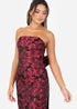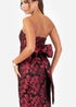 This midi dress features a sleek bodycon fit, bandeau neckline with anti-slip tape, and a back split for ease. A dramatic self-tie bow at the waist cascades into trailing tails, while raised red florals on a black base add depth and texture.