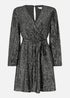 Festive partywear is here. Make an entrance in this Mela Black Sequin Wrap Dress. Incredibly flattering, this wow-factor dress benefits from a wrap around shape, matching sequin tie and long sleeves. Match with silver accessories for an unforgettable look.