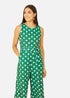 Learn moreWith a flattering, classic Green and white print, a cinched waist and a sleek sleeveless finish, this polka dot culotte jumpsuit by Mela is that multi-use garment your wardrobe's been missing. Whether it's a trainers of heels type of day, this jumpsuit has you covered.