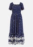 Mela Navy Spot And Floral Print Border Ruched Midi Dress