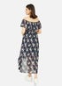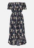 Mela Navy Tropical Printed Dipped Hem Bardot Dress