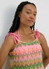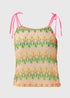 Add a pop of colour to your summer wardrobe with our vibrant Multicolour Crochet Co Ord Beach Top. Featuring a crochet zigzag crochet pattern, scoop neckline and tie adjustable straps. This top is fully lined and is made with a soft crochet feel fabric. This eye-catching piece is perfect for balmy days and beachy getaways. Pair with the matching shorts and sandals for a boho-chic ensemble or wear it over your swimsuit as a beach cover-up.