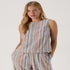 Introducing our Multicolour Stripe Co Ord Vest This vibrant sleeveless vest features a blend of vertical stripes in shades of blue, orange, and white. Perfect for a casual-chic look, it pairs effortlessly with jeans or shorts. Stand out in style with this eye-catching piece!