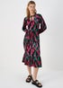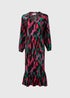 dress is a statement piece for any wardrobe. The abstract pattern exudes modern artistry, while the tie neck detail adds