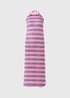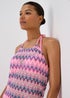 A vibrant and stylish addition to your summer wardrobe, this sleeveless dress features a playful zigzag pattern in shades of pink, blue, and white, offering a lively aesthetic. The halter neck design, adorned with a delicate tie closure, allows for adjustable comfort while showcasing the shoulders and upper back. Made from lightweight fabric, this dress promises breathability and ease of movement. Whether you're heading to a beach party or enjoying an afternoon brunch, this dress ensures you step out in style!