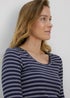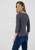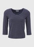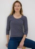 Elevate your casual wear with our Navy 3/4 Sleeve Stripe T-Shirt. Crafted from a blend of premium fabrics, this tee promises both comfort and durability. The navy base adorned with horizontal stripes exudes a classic yet contemporary aesthetic. Its 3/4 sleeves make it a versatile piece for transitioning weather, ensuring you stay stylish yet comfortable. The relaxed fit and the scoop neckline add a touch of femininity, making it a perfect choice for a laid-back weekend or a casual day out.