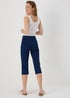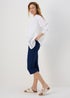 Crafted from high-quality bengaline fabric, these trousers offer a luxurious feel and a flattering fit. The stretchable material ensures maximum comfort, allowing free movement while retaining its stylish shape. With a versatile navy shade, these cropped trousers are an essential addition to your wardrobe, easily paired with any top for a chic look. The elegant design features a smooth waistband, creating a seamless silhouette that accentuates your figure.