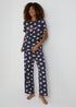 Sink into serenity with our exquisite navy dreamer heart pyjama set. Designed for dreamy comfort, this pyjama set exudes elegance and relaxation. Crafted from 100% cotton, this pyjama set is breathable and cosy for a peaceful night sleep. The navy short sleeve top with DREAMER print and matching navy bottoms with heart print all over creates a stylish night time look.