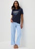 The Navy Gingham Pyjama Set offers a stylish blend of comfort and personality. The navy t-shirt features a fun "Bonjour, Hello, Ciao" graphic on the chest, adding a cheerful, multilingual touch. Paired with blue gingham-patterned bottoms.