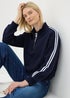 Step into effortless style with our luxurious Navy Half Zip Sweatshirt, a must-have addition to your wardrobe. Crafted from premium quality fabric, this sweatshirt exudes comfort and sophistication, making it perfect for any occasion. Featuring a funnel neck with a half zip fastening and long sleeves.