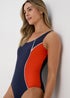 Learn moreLook effortlessly chic on your next beach holiday with our navy piped detail swimsuit. This swimsuit is designed for those who demand both style and performance with a stylish red side panel with a white piped detailing all round the swimsuit, it effortlessly combines style and practicality. The full coverage with supportive straps ensures a confident wear for all your swimming adventures.