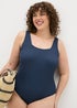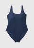Dive into summer in our chic and sporty navy ribbed swimsuit. This one-piece is crafted from high-quality fabric, ensuring a comfortable and flattering fit. Featuring a scoop back and a square neck for coverage. Pair it with denim shorts and a straw hat for a casual beachside look.