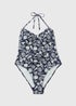Fresh and flattering with a playful edge, this navy shell print swimsuit is designed to make an effortless statement by the pool or at the beach. It features slim halter tie fastenings for an adjustable fit, while the ruched trims enhance and contour the silhouette. Full bottoms ensure good coverage. Stylish yet comfortable, itโs a timeless swim piece with a subtle touch of detail.
