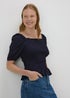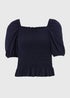 Add a touch of romance to your wardrobe with our Navy Shirred Square Neck Top. This stylish and feminine piece is designed to flatter and provide comfort, making it a perfect choice for both casual and dressy occasions. Featuring a charming square neckline that highlights the collarbone and adds a vintage-inspired touch. The bodice is adorned with delicate shirring, which provides a stretchy, form-fitting silhouette that accentuates the waist. With short puff sleeves with elasticated cuffs and a frilled hemline, adding a playful and feminine detail. This classic navy piece is perfect to layer under a blazer or tuck it into a midi skirt and add a statement belt for a sophisticated ensemble.