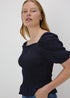 Learn moreAdd a touch of romance to your wardrobe with our Navy Shirred Square Neck Top. This stylish and feminine piece is designed to flatter and provide comfort, making it a perfect choice for both casual and dressy occasions. Featuring a charming square neckline that highlights the collarbone and adds a vintage-inspired touch. The bodice is adorned with delicate shirring, which provides a stretchy, form-fitting silhouette that accentuates the waist. With short puff sleeves with elasticated cuffs and a frilled hemline, adding a playful and feminine detail. This classic navy piece is perfect to layer under a blazer or tuck it into a midi skirt and add a statement belt for a sophisticated ensemble.