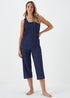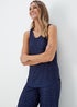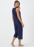 Learn moreKeep cool and comfy on warmer summer evenings in these cropped PJs. Crafted from light and airy fabric, the navy set features a contrasting cream spotted print for added style points. The vest top is cut with a sleeveless silhouette, alongside a scoop neckline and a curved hem. The matching capri bottoms feature a cropped leg length and are trimmed with a stretchy elasticated waistband for maximum comfort.