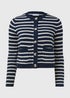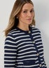 Learn moreThis cardigan features a timeless navy and white stripe design, adding a touch of nautical charm to your look. With its button-up front, it offers versatility in styling and layering. Tailored for comfort and style, this piece is perfect for completing casual or smart-casual ensembles