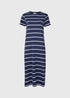 Learn moreThis dress ensures both relaxation and a chic aesthetic. The classic navy base adorned with white horizontal stripes exudes a nautical vibe, making it a timeless piece for any wardrobe. Featuring a modest round neckline and short sleeves, this midi dress is versatile for various occasions. Whether you're heading to the office or enjoying a seaside stroll, our Navy Stripe Jersey Midi Dress promises to keep you looking sophisticated and feeling fabulous.