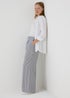 Take your style up a notch with our Navy Stripe Wide Trousers. Cut from a high-quality fabric, these trousers boast a flattering wide-leg silhouette and feature a fun stripe pattern that adds a touch of elegance. The pleated front adds a touch of sophistication, while the wide waistband ensures a comfortable and flattering fit. Perfect for both work and casual, these trousers will quickly become a staple in your everyday wardrobe. Dress these trousers up with a crisp blouse and heels for the perfect work outfit or pair them with a casual top and trainers for a relaxed weekend look.