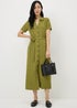 Add a pop of colour to your work to weekend wardrobe with this vibrant shirt dress. Crafted from olive green textured jersey fabric, the timeless dress is cut in a billowing midaxi silhouette. Featuring a smart open collar, full button front, short sleeves and a belted waist, it combines the classic shirt dress design with a flattering shape that nips in at the middle.