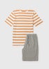 Learn moreThe set features a classic orange stripe crew neck T-shirt paired with contrasting grey shorts, ensuring you look as good as you feel whether you're lounging at home or stepping out for a casual day out.