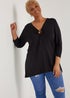 Learn moreA versatile piece that can easily be dressed up or down, say hello to this chic Papaya Curve top. Cut with a flattering ring detail to the front, it's crafted from black viscose for sumptuously soft comfort. Also featuring a nice amount of stretch, this billowing number is finished with long sleeves and an uber flattering V-neck.