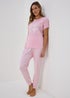 Learn moreAdd some colour and flair to your nightwear collection with these pink floral print trousers. These trousers are made from a soft and breathable fabric that ensures maximum comfort and a flattering fit. The delicate white floral print on the pink backdrop adds a touch of femininity and charm to your look. The trousers have an elastic waistband for an adjustable and snug fit, and cuffed legs for a modern and sleek silhouette.