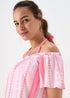 Learn moreAdorned with a beautiful jacquard pattern in shades of pink and white, this mini dress exudes femininity and grace. Crafted from premium viscose fabric, this dress promises a soft touch against your skin and ensures breathability. The off-shoulder Bardot neckline adds a touch of glamour, making it an ideal choice for both casual outings and special occasions.