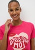 Add a playful touch to bedtime with this pink pyjama set, crafted from soft, breathable 100% cotton for all-night comfort. The pyjama top features a fun “Bisous Pour Moi” graphic, together with a classic crew neckline and short sleeves. The candy-striped PJ bottoms are styled with a stretchy elasticated waistband and cut with a comfy, wide-leg silhouette.