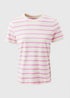 Indulge in coastal charm with our Stripe Crew Neck T-Shirt in pink and cream, an effortlessly chic addition to your spring-summer repertoire. Crafted from a luxurious cotton-blend, this tee provides unparalleled comfort and a touch of sophistication. Create a refined casual look by tucking it into high-waisted trousers and adding dainty jewellery for a touch of elegance.