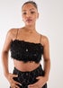 Learn moreElevate your partywear looks with this dreamy feather sequin cami top. This crop top is an absolute statement piece you want in your wardrobe now. Style it with our Diamante Jeans for a killer look or a leather mini skirt for a fun outfit.