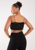 Elevate your partywear looks with this dreamy feather sequin cami top. This crop top is an absolute statement piece you want in your wardrobe now. Style it with our Diamante Jeans for a killer look or a leather mini skirt for a fun outfit.